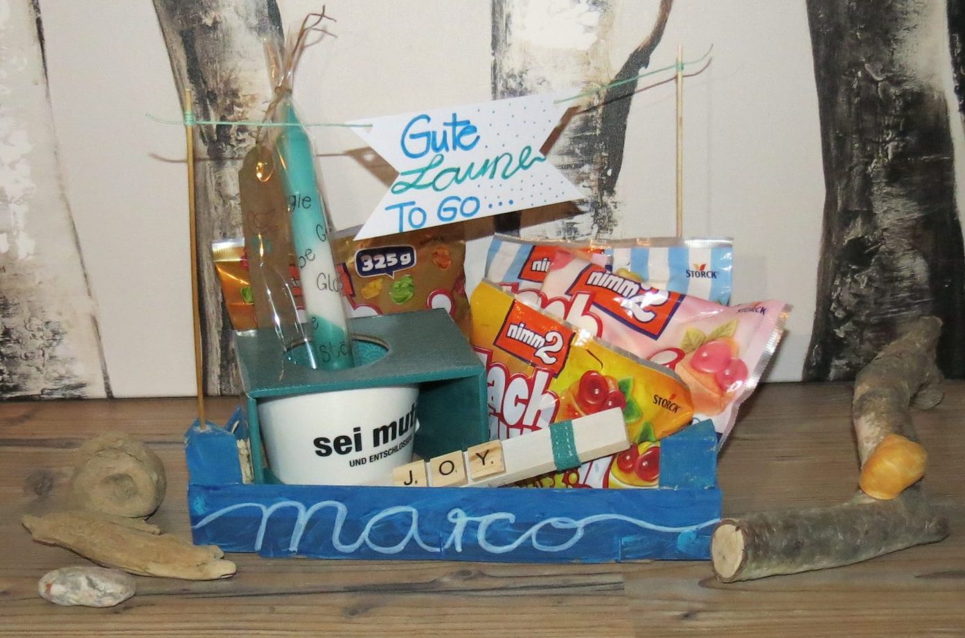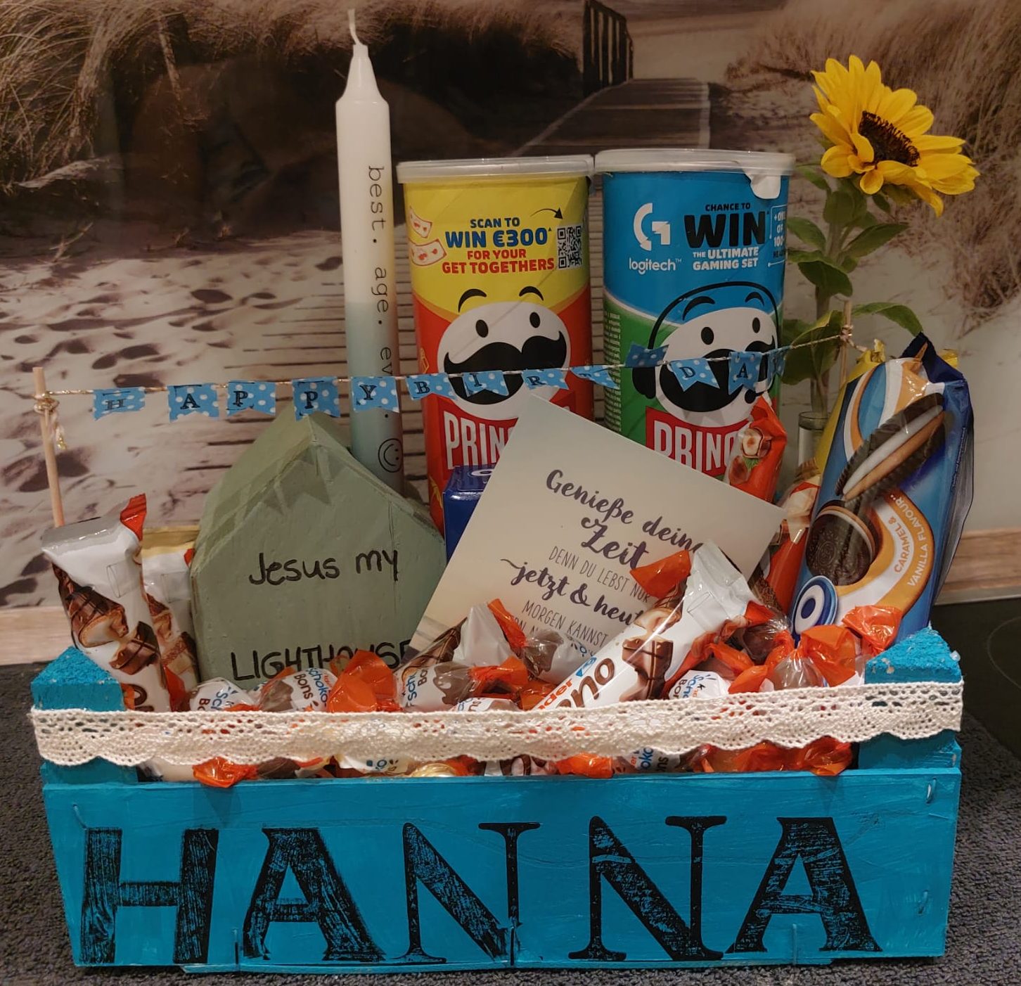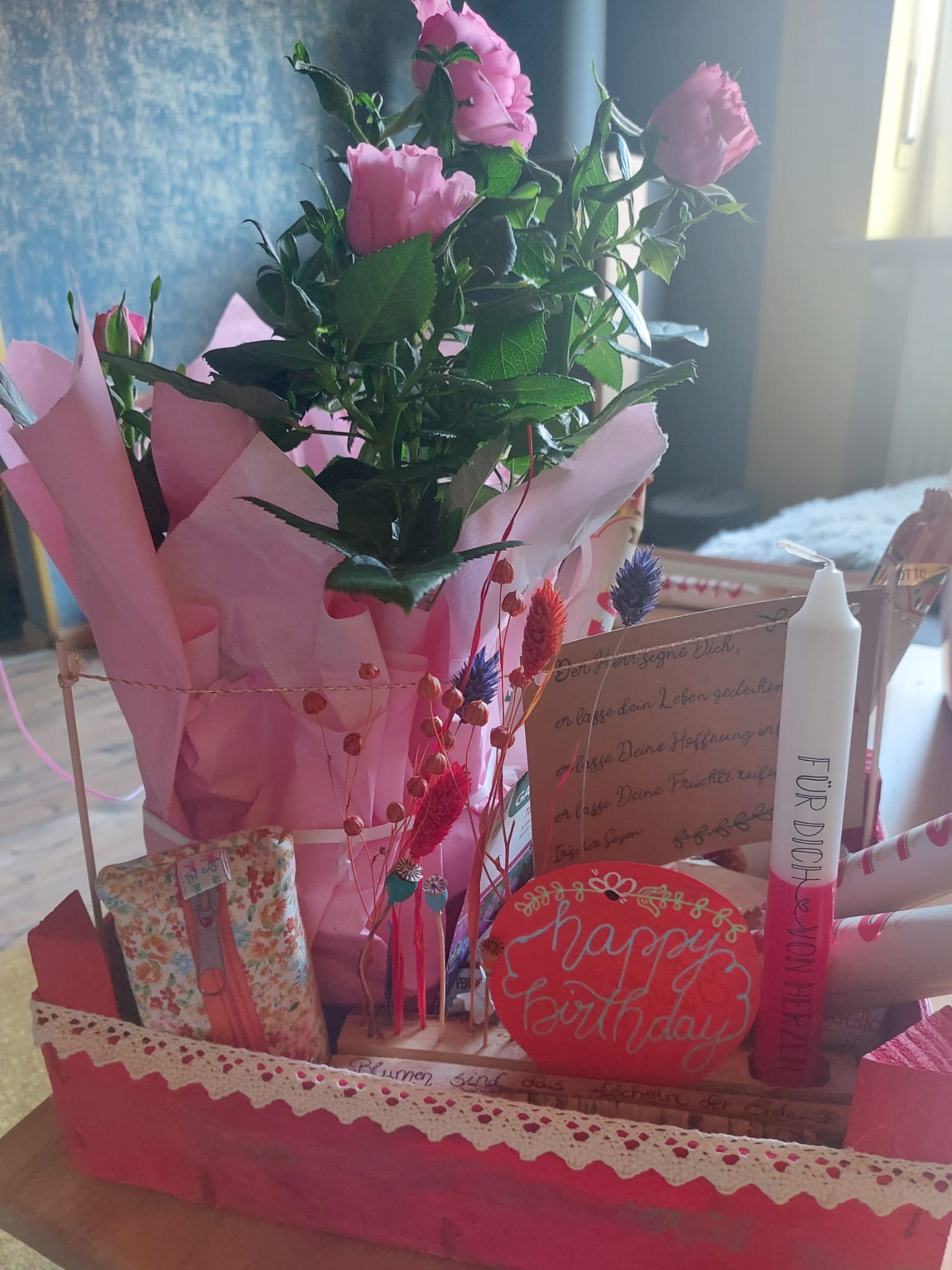 Geschenkekiste mit Blumen und Kartenständer mit selbst beschrifteter Kerze